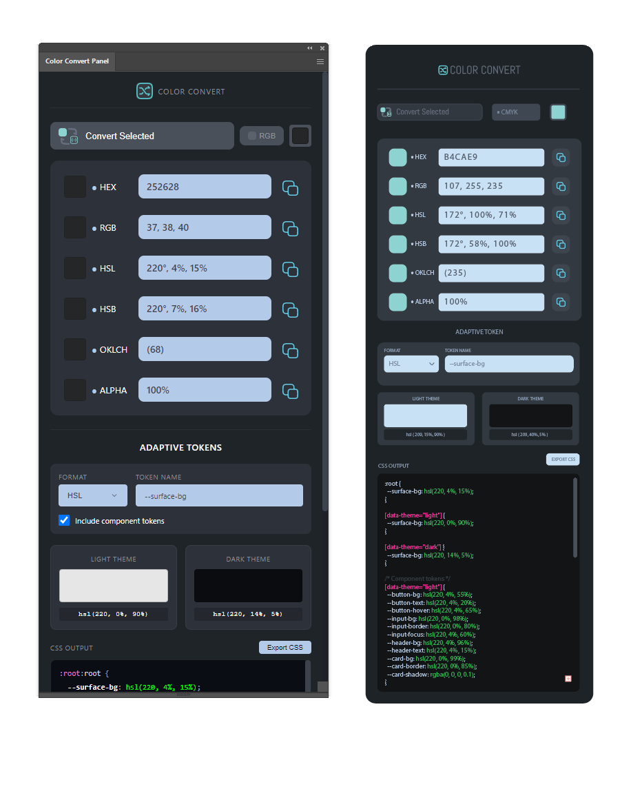 Just set your token name and format — the panel builds clean, ready-to-use CSS variables for your design system.